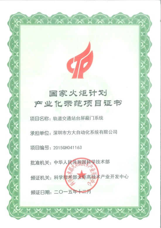 方大集團“軌道交通站臺屏蔽門系統”項目獲“國家火炬計劃產業化示范項目”證書
