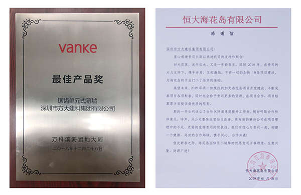富力集團授予方大建科“2018年度優秀承建商”、前海人壽授予方大建科“2018年度優秀供應商”、 萬科授予方大建科“最佳產品獎”、恒大海花島給方大建科一封感謝信。年末獲得的各大地產商授予的榮譽,涵蓋產品質量、工程交期、客戶服務等多個方面,是業主對方大建科在2018年經營管理及公司綜合實力的充分認可。